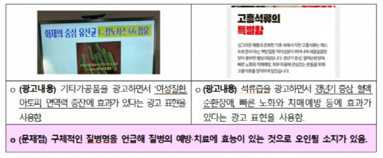 ºÎ´ç Ç¥½Ã ±¤°í°¡ ¿ì·ÁµÇ´Â ³»¿ëÀÌ Æ÷ÇԵŠÀÖ´Â 30°Ç °¡¿îµ¥ 14°Ç(46.7%)Àº '½Äǰǥ½Ã±¤°í¹ý' À§¹Ý ¼ÒÁö°¡ ÀÖ¾ú´Ù. ƯÈ÷ °Ç°±â´É½Äǰ ±¤°í 6°ÇÀº Çѱ¹°Ç°±â´É½ÄǰÇùȸÀÇ »çÀü ±¤°í ½ÉÀǸ¦ ¹Þ¾Æ¾ß ÇÏÁö¸¸ ÀÌ·± °úÁ¤À» °ÅÄ¡Áö ¾Ê°í ¹æ¼ÛÀ» Çß´Ù.