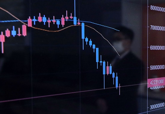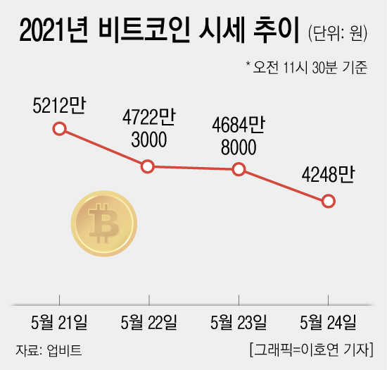 °¡»óÈÆó °Å·¡¼Ò ¾÷ºñÆ®¿¡ µû¸£¸é 24ÀÏ ¿ÀÀü 11½Ã30ºÐ ±âÁØ ºñÆ®ÄÚÀÎÀº 24½Ã°£ Àü(4684¸¸8000¿ø)º¸´Ù 9.3% Ç϶ôÇÑ 4248¸¸¿ø¿¡ °Å·¡µÆ´Ù. À̳¯ ¿ÀÀü 1½Ã30ºÐ¿¡´Â 3966¸¸8000¿ø±îÁö ¶³¾îÁö±âµµ Çß´Ù. 4000¸¸¿øÀÌ ¾Æ·¡·Î ¶³¾îÁø °ÍÀº 2¿ù 4ÀÏ(3981¸¸¿ø) ÀÌÈÄ 110ÀÏ ¸¸ÀÌ´Ù. °°Àº ½Ã°£ ºø½æ¿¡¼ ºñÆ®ÄÚÀÎÀº 4683¸¸9000¿ø¿¡¼ 4243¸¸3000¿øÀ¸·Î 9.4% ¶³¾îÁ³´Ù.