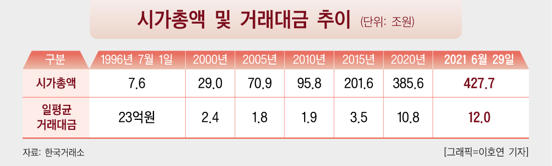30ÀÏ Çѱ¹°Å·¡¼Ò(°Å·¡¼Ò)´Â ÄÚ½º´Ú ½ÃÀå °³Àå 25ÁÖ³âÀ» ¸Â¾Æ ÁÖ¿ä ¼º°ú¸¦ ºÐ¼®ÇØ ¹ßÇ¥Çß´Ù. ÀÌ¿¡ µû¸£¸é 29ÀÏ ±âÁØ ÄÚ½º´Ú ½ÃÀå ½Ã°¡ÃѾ×Àº 428Á¶¿øÀ¸·Î Ãâ¹üÀÏÀÎ 1996³â 7¿ù 1ÀÏ(7Á¶6000¾ï¿ø)°ú ºñ±³ÇØ 50¹è ³Ñ°Ô ¼ºÀåÇß´Ù. °°Àº ±â°£ ÀÏÆò±Õ °Å·¡´ë±Ýµµ 23¾ï¿ø¿¡¼ 12Á¶¿øÀ¸·Î 500¹è ºÒ¾î³ª¸ç ÃÖ°íÄ¡¸¦ °æ½ÅÇß´Ù.