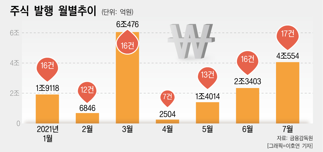 ÁÖ½Ä ¹ßÇà ±Ô¸ð´Â ÃÑ 4Á¶554¾ï¿ø(17°Ç)À¸·Î Àü¿ù ´ëºñ 1Á¶7151¾ï¿ø(73.3%) Áõ°¡Çß´Ù. ÀÌ Áß ±â¾÷°ø°³´Â 3Á¶2083¾ï¿ø(7°Ç)À¸·Î Àü¿ù ´ëºñ 3Á¶888¾ï¿ø(2584.8%) ´Ã¾î³µ´Ù. īī¿À¹ðÅ©(2Á¶5526¾ï¿ø), ¿¡½ºµð¹ÙÀÌ¿À¼¾¼(5176¾ï¿ø) µî ÄÚ½ºÇÇ »óÀåÀ» À§ÇÑ ´ëÇü ±â¾÷°ø°³(IPO)·Î ¹ßÇà ±Ô¸ð°¡ Å©°Ô È®´ëµÆ´Ù.