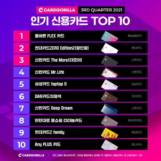 ½Å¿ëÄ«µå Àü¹®»çÀÌÆ® Ä«µå°í¸±¶ó°¡ ¿ÃÇØ 3ºÐ±â ¡®Àα⠽ſëÄ«µå TOP 10¡¯À» Á¶»çÇÑ °á°ú ¡®NH³óÇù ¿Ã¹Ù¸¥ FLEX Ä«µå¡¯°¡ óÀ½ Á¤»ó¿¡ ¿Ã¶ú´Ù°í 3ÀÏ ¹ßÇ¥Çß´Ù. À̹ø Á¶»ç´Â 7¿ù 1ÀϺÎÅÍ Áö³´Þ 24ÀϱîÁö Ä«µå°í¸±¶ó À¥»çÀÌÆ®(PC¡¤¸ð¹ÙÀÏ ÅëÇÕ)¿¡¼ Áý°èµÈ °¢ ½Å¿ëÄ«µå »óǰÁ¶È¸¼ö ¹× ½ÅûÀüȯ¼ö¸¦ ±âÁØÀ¸·Î ¼øÀ§¸¦ ¸Å°å´Ù.