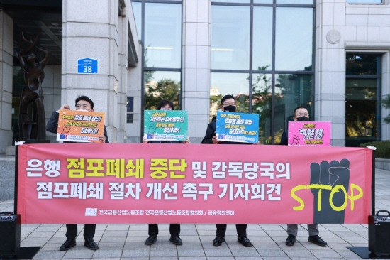 27ÀÏ ±ÝÀ¶±Ç¿¡ µû¸£¸é Àü±¹ÀºÇà»ê¾÷³ëµ¿Á¶ÇÕÇùÀÇȸ(ÀÌÇÏ ÀüÀºÇù)°ú Àü±¹±ÝÀ¶»ê¾÷³ëµ¿Á¶ÇÕ(ÀÌÇÏ ±ÝÀ¶³ëÁ¶)°ú ±ÝÀ¶Á¤ÀÇ¿¬´ë´Â 25ÀÏ ±ÝÀ¶°¨µ¶¿ø(±Ý°¨¿ø) ¾Õ¿¡¼ ±âÀÚȸ°ßÀ» ¿°í ¡°½ÇÀû °æÀïÇϵí Á¡Æ÷ Æó¼â¸¦ À̾´Â ÀºÇà¿¡ ´ëÇÑ ±Ý°¨¿øÀÇ Á¦Àç°¡ ÇÊ¿äÇÏ´Ù¡±°í ÁÖÀåÇß´Ù.