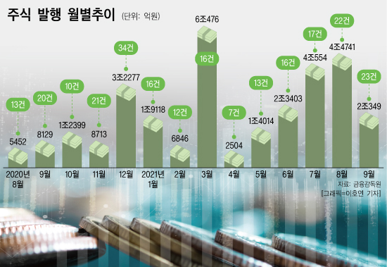 Áö³´Þ ÁÖ½Ä ¹ßÇàÀÌ Àü´Þº¸´Ù 50% ÀÌ»ó ÁÙ¾ú´Ù. 8¿ù¿¡ īī¿À¹ðÅ©, Å©·¡ÇÁÅæ µî ±â¾÷°ø°³(IPO)°¡ Ȱ¹ßÇß´ø ¹Ý¸é Áö³´Þ¿¡´Â IPO ±¤Ç³ÀÌ ºñ±³Àû ÀáÀáÇ߱⠶§¹®ÀÌ´Ù. ÀÌ¿¡ ºñÇØ ȸ»çä´Â ÀϹÝȸ»ç並 Áß½ÉÀ¸·Î Å©°Ô ´Ã¾ú´Ù. ±âÁرݸ® Àλó µîÀÇ ¿©ÆÄ°¡ ½ÃÀå¿¡ ¹Ý¿µµÈ °á°ú·Î Ç®À̵ȴÙ.