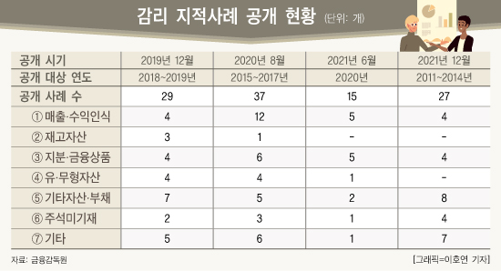 29ÀÏ ±Ý°¨¿øÀº 2011³âºÎÅÍ 2014³â±îÁö ³ªÅ¸³ ÁöÀû»ç·Ê 27°ÇÀ» Ãß°¡ÇØ IFRS(±¹Á¦È¸°è±âÁØ) ½ÃÇà ÀÌÈÄ 10³â °£(2011~2020³â)ÀÇ ÁöÀû»ç·Ê ÃÑ 108°ÇÀ» °ø°³Çß´Ù. ±×°£ ±Ý°¨¿øÀº ±â¾÷ÀÌ ¿øÄ¢Áß½ÉÀÇ IFRS¸¦ Àû¿ëÇÏ´Â µ¥ µµ¿òÀ» ÁÖ°í À¯»çÇÑ È¸°è¿À·ù ¹ß»ýÀ» ¹Ì¿¬¿¡ ¹æÁöÇϱâ À§ÇØ °¨¸® ÁöÀû»ç·Ê DB¸¦ ±¸ÃàÇÏ°í °ø°³ÇؿԴÙ.