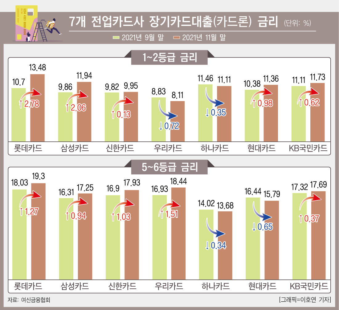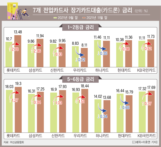 3ÀÏ ¿©½Å±ÝÀ¶Çùȸ °ø½Ã¿¡ µû¸£¸é Áö³ÇØ 11¿ù¸» ±âÁØ 7°³ Àü¾÷Ä«µå»ç(·Ôµ¥¡¤»ï¼º¡¤½ÅÇÑ¡¤¿ì¸®¡¤Çϳª¡¤Çö´ë¡¤KB±¹¹Î) °¡¿îµ¥ 5°³ Ä«µå»çÀÇ Æò±Õ ±Ý¸®°¡ 9¿ù¿¡ ºñÇØ Å©°Ô ¿Ã¶ú´Ù. ƯÈ÷ Àå±âÄ«µå´ëÃâ(Ä«µå·Ð) ±Ý¸®ÀÇ °æ¿ì 1~2µî±Þ °í½Å¿ëÀÚÀÇ Áö³ÇØ 11¿ù ´ëÃâ±Ý¸®´Â Áö³ÇØ 9¿ù°ú ºñ±³ÇØ 5°÷¿¡¼ »ó½ÂÇß°í 5~6µî±Þ Á߽ſëÀÚ ±Ý¸®µµ 5°÷¿¡¼ ¿Ã¶ú´Ù.