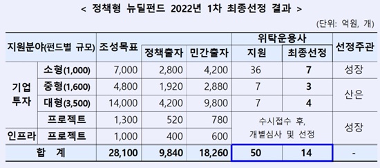 Çѱ¹»ê¾÷ÀºÇà(»êÀº)°ú Çѱ¹¼ºÀå±ÝÀ¶ÀÌ ¡®Á¤Ã¥Çü ´ºµôÆÝµå¡¯ 2022³â 1Â÷ À§Å¹¿î¿ë»ç ¼±Á¤ °á°ú 3.6´ë 1ÀÇ °æÀï·üÀ» ¶Õ°í 14°³ ¿î¿ë»ç°¡ ÃÖÁ¾ ¼±Á¤µÆ´Ù°í 9ÀÏ ¹àÇû´Ù.