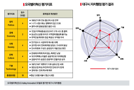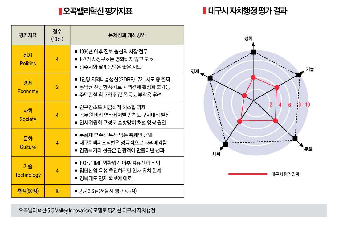 Çö´ë Á¤Ä¡»ç¸¦ ÁÖµµÇÑ TK(´ë±¸°æºÏ)ÀÇ ÇÙ½É ±Ù°ÅÁöÀÎ ´ë±¸´Â Áøº¸¼¼·ÂÀÇ ±¸½ÉÁ¡ÀÎ ±¤ÁÖ±¤¿ª½Ã¿Í ´ëôÁ¡¿¡ ¼ÀÖ´Ù. ´ë±¸½ÃÀÇ ÀÚÄ¡ÇàÁ¤À» ±¹°¡Á¤º¸Àü·«¿¬±¸¼Ò°¡ °³¹ßÇÑ ¡®¿À°î(çéÍÚ)¹ë¸®Çõ½Å(5G Valley Innovation)¡¯ ¸ðµ¨À» Àû¿ëÇØ Æò°¡ÇغôÙ.