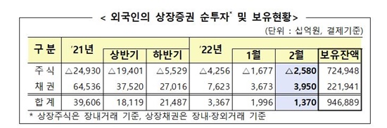 14ÀÏ ±ÝÀ¶°¨µ¶¿ø(±Ý°¨¿ø)ÀÌ ¹ßÇ¥ÇÑ ¡®2022³â 2¿ù ¿Ü±¹ÀÎ Áõ±ÇÅõÀÚ µ¿Ç⡯¿¡ µû¸£¸é ¿Ü±¹ÀÎÀº Áö³´Þ ±¹³» »óÀåÁÖ½ÄÀ» 2Á¶5800¾ï¿ø ¼ø¸ÅµµÇß´Ù. Áö³ 1¿ù(-1Á¶6770¾ï¿ø)¿¡ ÀÌ¾î µÎ ´Þ ¿¬¼Ó ¡®ÆÈÀÚÇàÁø¡¯À» À̾´Ù.
