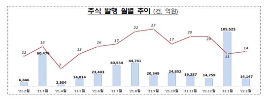 24ÀÏ ±ÝÀ¶°¨µ¶¿ø(±Ý°¨¿ø)ÀÌ ¹ßÇ¥ÇÑ ¡®2022³â 2¿ùÁß ±â¾÷ÀÇ Á÷Á¢±ÝÀ¶ Á¶´Þ½ÇÀû¡¯¿¡ µû¸£¸é Áö³´Þ ÁÖ½Ä ¹ßÇà ±Ô¸ð´Â ÃÑ 14°Ç, 1Á¶4147¾ï¿øÀ¸·Î Áý°èµÆ´Ù. ÀÌ´Â Àü¿ù(13°Ç, 10Á¶5525¾ï¿ø) ´ëºñ 86.6%(9Á¶1378¾ï¿ø) ÁÙ¾îµç ¼öÁØÀÌ´Ù.