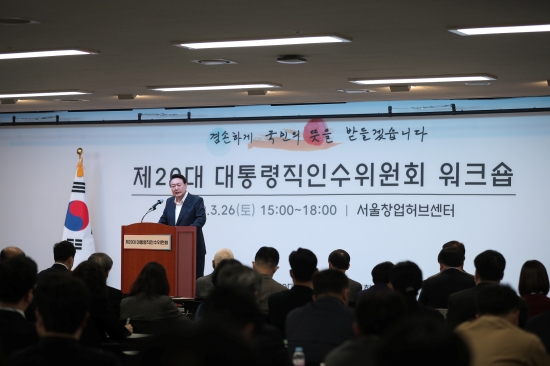 ¡ã ´ëÅë·ÉÁ÷¼öÀμöÀ§¿øÈ¸°¡ Ãâ¹ü 8ÀÏ ¸¸¿¡ º»°ÝÀûÀ¸·Î ±¹Á¤°úÁ¦¸¦ ³íÀÇÇϱâ À§ÇÑ Ã¹ ¿öÅ©¼óÀ» 26ÀÏ ¼¿ï ¸¶Æ÷±¸ ¼¿ïâ¾÷Çãºê ÄÁÆÛ·±½ºÈ¦¿¡¼ ¿¸° °¡¿îµ¥ À±¼®¿ ´ç¼±ÀÎÀÌ ±¹¹ÎÀǷʸ¦ Çϰí ÀÖ´Ù. ÀμöÀ§ Àü¿ø 180¿©¸íÀÌ Ã³À½À¸·Î ÇÑÀÚ¸®¿¡ ¸ðÀÎ À̳¯ À±¼®¿ ´ç¼±ÀÎÀº ¡°Á¦ÀÏ Áß¿äÇÑ °Ç °æÁ¦¡±¶ó°í ´çºÎÇÏ¸é¼ ±¹Á¤°úÁ¦ ¼±Á¤ ±âÁØÀ¸·Î´Â ¡®½Ç¿ëÁÖÀÇ¡¯¿Í ¡®±¹¹ÎÀÇ ÀÌÀÍ¡¯À» Á¦½ÃÇß´Ù. [±¹¹ÎÀÇÈû] ¨Ï½ºÄ«À̵¥Àϸ®