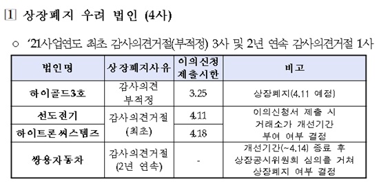ÀÌ¿¡ µû¸£¸é 2021»ç¾÷¿¬µµ¿¡ ÃÖÃÊ·Î °¨»çÀǰßÀÌ °ÅÀýµÈ ¼±µµÀü±â, ÇÏÀÌÆ®·Ð¾¾½ºÅÛÁî µîÀº ÀÌÀǽÅû¼ Á¦Ã⠽à °Å·¡¼Ò°¡ °³¼±±â°£ ºÎ¿© ¿©ºÎ¸¦ °áÁ¤Çϱâ·Î Çß´Ù. °¨»çÀÇ°ß ºÎÀûÁ¤ÀÎ ÇÏÀ̰ñµå3È£´Â 11ÀÏ »óÀåÆóÁö µÉ ¿¹Á¤ÀÌ´Ù. Áö³´Þ 3ÀÏ °¨»çÀÇ°ß ºÎÀûÁ¤À¸·Î »óÀåÆóÁö°¡ ¿¹°íµÈ ÈÄ Áö³´Þ 25ÀϱîÁö ÀÌÀǽÅû¼¸¦ Á¦ÃâÇÏÁö ¾Ê¾Æ »óÀåÆóÁö°¡ È®Á¤µÆ´Ù.