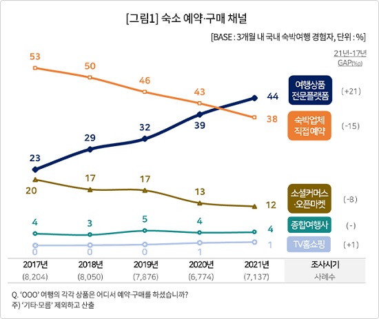 ¼ÒºñÀÚ¸®¼Ä¡¡¤µ¥ÀÌÅÍ À¶º¹ÇÕ Àü¹® ¿¬±¸±â°ü ÄÁ½´¸ÓÀλçÀÌÆ®´Â ¡®ÁÖ·Ê ¿©Çà ÇàÅ ¹× °èȹ Á¶»ç¡¯¿¡¼ ÃÖ±Ù 3°³¿ù ³» ±¹³» ¿©ÇàÀÚ¿¡°Ô ¾î¶² ä³Î¿¡¼ ¾î¶² ¹æ¹ýÀ¸·Î ¼÷¼Ò¸¦ ¿¹¾àÇß´ÂÁö ¹¯°í 2017³â ÀÌÈÄ 5³â°£ÀÇ °á°ú¸¦ ºñ±³ÇÑ °á°ú¸¦ 13ÀÏ ¹ßÇ¥Çß´Ù.