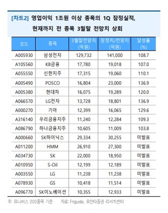 26ÀÏ À¯¾ÈŸÁõ±Ç¿¡ µû¸£¸é »ï¼ºÀüÀÚ¿Í LGÀüÀÚ, Çö´ëÂ÷, Æ÷½ºÄÚ, ±â¾Æ, 4´ë ÀºÇàÁÖ(KB±ÝÀ¶¡¤½ÅÇÑÁöÁÖ¡¤¿ì¸®±ÝÀ¶ÁöÁÖ¡¤Çϳª±ÝÀ¶ÁöÁÖ) µî 9Á¾¸ñÀº ¸ðµÎ 1ºÐ±â ¾î´×¼ÇÁ¶óÀÌÁ ±â·ÏÇß´Ù. À̵éÀÇ 1ºÐ±â ¿µ¾÷ÀÌÀÍ ÇÕÀº ÃÑ 27Á¶9526¾ï¿øÀ¸·Î Àü¸ÁÄ¡(24Á¶5678¾ï¿ø)¸¦ 13.8% ¶Ù¾î³Ñ¾ú´Ù. À¯´Ï¹ö½º200Á¾¸ñ Àüü ¿µ¾÷ÀÌÀÍ Áß Àý¹Ý¿¡ À°¹ÚÇÑ ¼öÁØÀÌ´Ù.