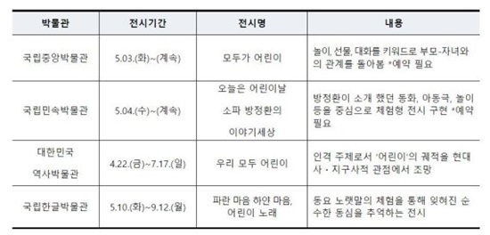 ¿ÃÇØ´Â ¾î¸°À̳¯ÀÌ 100ȸ¸¦ ¸ÂÀÌÇÏ´Â ÇØ´Ù. ±¹¸³¹Ú¹°°üµéÀº °¢ ¹Ú¹°°üÀÇ ÁÖÁ¦¿Í ¼º°Ý¿¡ ¸ÂÃá ¾î¸°ÀÌ Çà»ç¸¦ ¼±º¸ÀÏ ¿¹Á¤ÀÌ´Ù. ±¹¸³Áß¾Ó¹Ú¹°°üÀº 3ÀϺÎÅÍ ¡®¸ðµÎ°¡ ¾î¸°ÀÌ¡¯ Àü½Ã¸¦ ÁøÇàÇÑ´Ù. ³îÀÌ¡¤¼±¹°¡¤´ëȸ¦ Ű¿öµå·Î ºÎ¸ð¿Í ÀÚ³àÀÇ °ü°è¸¦ µ¹¾Æº¸´Â Àü½Ã´Ù.