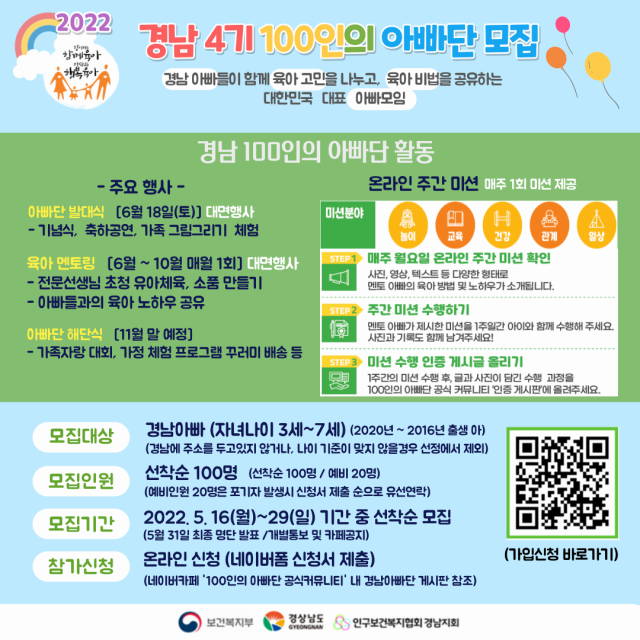 ÀåÀçÇõ °æ»ó³²µµ Á¤Ã¥±âȹ°üÀº ¡°°æ³²100ÀÎÀÇ ¾Æºü´ÜÀ» ÅëÇØ ¾Æºü¿Í ÀÚ³àµé°úÀÇ À¯´ë°¨ Çü¼ºÀ» µ½°í, ¾ÆÀÌ¿ÍÀÇ ¼ÒÁßÇÑ Ãß¾ï ¸¸µé±â µî ¾Æºü°¡ ÇÔ²² À°¾ÆÇÏ´Â »çȸ ºÐÀ§±â È®»ê¿¡ ³ë·ÂÇϰڴ١±°í ¹àÇû´Ù.