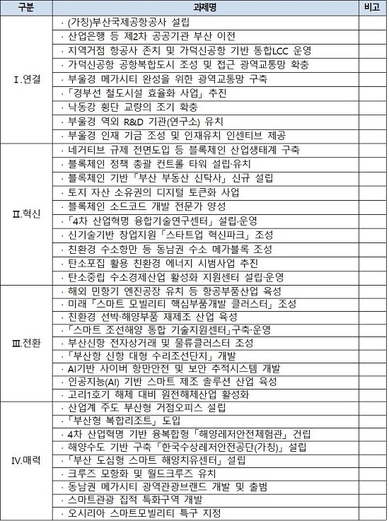 ¿ì¼± ¡®¿¬°á¡¯ ºÎ¹®ÀÇ ÁÖ¿ä °úÁ¦·Î (°¡Äª)ºÎ»ê±¹Á¦°øÇ×°ø»ç ¼³¸³, »ê¾÷ÀºÇà µî Á¦2Â÷ °ø°ø±â°ü ºÎ»ê ÀÌÀü, Áö¿ª°ÅÁ¡ Ç×°ø»ç Á¸Ä¡ ¹× °¡´ö½Å°øÇ× ±â¹Ý ÅëÇÕLCC ¿î¿µ, ºÎ¿ï°æ ¸Þ°¡½ÃƼ ¿Ï¼ºÀ» À§ÇÑ ±¤¿ª±³Åë¸Á ±¸Ãà µî 9°³ÀÇ °úÁ¦¸¦ ¼±Á¤Çß´Ù.