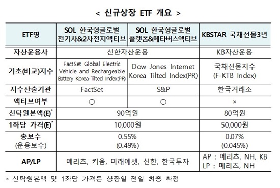 Çѱ¹°Å·¡¼Ò(°Å·¡¼Ò)°¡ ½ÅÇÑÀÚ»ê¿î¿ëÀÇ Àü±âÂ÷¡¤2Â÷ÀüÁöÅ׸¶, Ç÷§Æû¡¤¸ÞŸ¹ö½º ¾÷Á¾Å׸¶ÀÇ ¾×ƼºêÇü »óÀåÁö¼öÆÝµå(ETF) 2Á¾¸ñ, KBÀÚ»ê¿î¿ëÀÇ Ã¤±ÇÇü ETF 1Á¾¸ñÀ» 14ÀÏ À¯°¡Áõ±Ç½ÃÀå¿¡ »óÀåÇÑ´Ù.