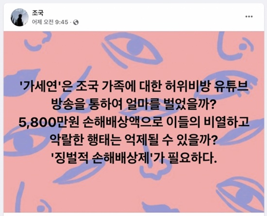 12ÀÏ Á¤Ä¡±Ç¿¡ µû¸£¸é Á¶ Àü Àå°üÀº Àü³¯ ¿ÀÀü 9½Ã45ºÐÂë ÀÚ½ÅÀÇ ÆäÀ̽ººÏ °èÁ¤¿¡ ¡°°¡¼¼¿¬Àº Á¶±¹ °¡Á·¿¡ ´ëÇÑ ÇãÀ§ºñ¹æ À¯Æ©ºê ¹æ¼ÛÀ» ÅëÇÏ¿© ¾ó¸¶¸¦ ¹ú¾úÀ»±î¡±¶ó´Â ±ÛÀ» ¿Ã·È´Ù.