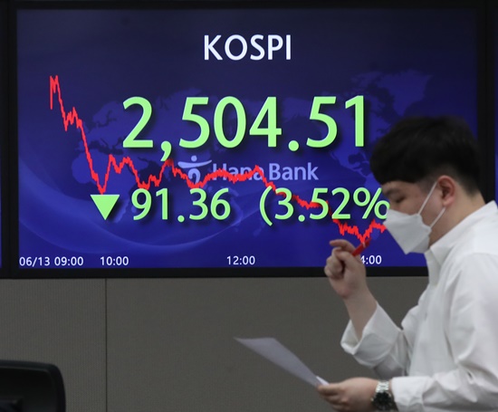 13ÀÏ ÄÚ½ºÇÇÁö¼ö´Â Àü °Å·¡ÀϺ¸´Ù 91.36p(3.52%) ³»¸° 2504.51¿¡ ÀåÀ» ¸¶ÃÆ´Ù. Áö¼ö´Â 10ÀÏ(ÇöÁö½Ã°£) ¹ßÇ¥µÈ ¹Ì±¹ ¹°°¡ Ãæ°Ý ¿©ÆÄ·Î ÀüÀ庸´Ù 45.66p(1.76%) ³»¸° 2550.21¿¡ °³ÀåÇØ Àå ÃʹݺÎÅÍ ±Þ¶ôÇß°í ¿ÀÈÄ µé¾î ³«ÆøÀ» Ű¿ü´Ù. Áö³´Þ 12ÀÏ ±â·ÏÇÑ ±âÁ¸ ¿¬ÀúÁ¡(2546.80)À» ¶ÕÀº µ¥ À̾î Á¾°¡ ±âÁØÀ¸·Î 2020³â11¿ù13ÀÏ(2493.97) ÀÌÈÄ 1³â7°³¿ù ¸¸¿¡ °¡Àå ³·Àº ¼öÁØÀ» ±â·ÏÇß´Ù.