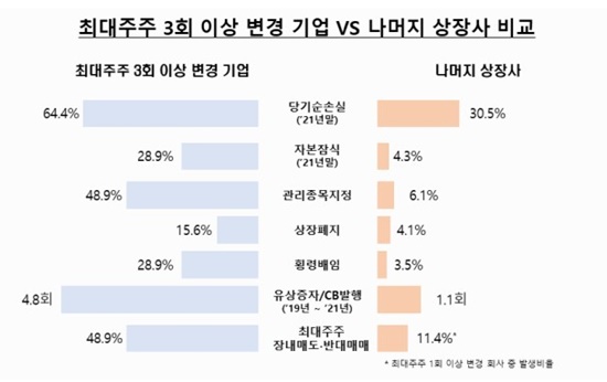 ÃÖ±Ù 3³â°£ ÃÖ´ëÁÖÁÖ¸¦ º¯°æÇÑ »óÀå±â¾÷ÀÌ 500°³ ÀÌ»óÀÎ °ÍÀ¸·Î µå·¯³µ´Ù. Àüü »óÀå»ç ´Ù¼¸ °³ Áß ÇÑ °³ ²ÃÀÌ´Ù. 3ȸ ÀÌ»ó º¯°æµÈ ±â¾÷µµ ¸¹¾Ò´Ù. À̵éÀº À繫»óÅ ºÎ½Ç, °ü¸®Á¾¸ñ ÁöÁ¤, »óÀåÆóÁö, Ⱦ·É¡¤¹èÀÓ µîÀÇ À§ÇèÀÌ ¸Å¿ì ³ô¾Ò´Ù. ÀÌ¿¡ µû¶ó ±ÝÀ¶´ç±¹Àº ÃÖ´ëÁÖÁÖ º¯°æÀÌ ºó¹øÇÑ È¸»ç¸¦ °íÀ§Ç豺À¸·Î ºÐ·ùÇØ °ø½Ã½É»ç¸¦ °ÈÇÒ ¹æÄ§ÀÌ´Ù.