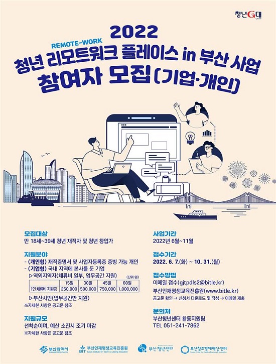 ºÎ»ê±¤¿ª½Ã´Â Ÿ Áö¿ª¿¡ °ÅÁÖÇϴ û³âµéÀÌ ºÎ»ê¿¡¼ ¿ø°Ý±Ù¹«¸¦ ÇÒ ¼ö ÀÖµµ·Ï Áö¿øÇÏ´Â ¡®¸®¸ðÆ® ¿öÅ©¡¯ Áö¿ø»ç¾÷À» ½Ã¹ü ÃßÁøÇϰí 10¿ù±îÁö »ç¾÷ Âü¿©ÀÚ¸¦ ¸ðÁýÇÑ´Ù°í 10ÀÏ ¹àÇû´Ù.