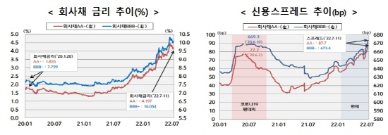 ½ÇÁ¦·Î ÀÌ´Þ 11ÀÏ ±âÁØ È¸»çä ½ºÇÁ·¹µå´Â AA-(87.7bp), BBB-(673.4bp)·Î Äڷγª19 ±â°£ ÃÖ°íÄ¡(2020³â 6¿ù °¢°¢ 77.7bp, 669.3bp)º¸´Ù ³ôÀº »óȲÀÌ´Ù. CP(A1, 91ÀϹ°) ±Ý¸®µµ 1¿ù 1.58%¿¡¼ ÀÌ´Þ 11ÀÏ 2.36%·Î »ó½ÂÇß´Ù.