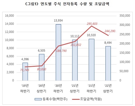 25ÀÏ Çѱ¹¿¹Å¹°áÁ¦¿ø(¿¹Å¹¿ø)¿¡ µû¸£¸é ¿ÃÇØ »ó¹Ý±â ¿¹Å¹¿øÀ» ÅëÇØ ÁÖ½ÄÀ» ÀüÀÚµî·ÏÇÑ È¸»ç´Â 928°³»ç·Î Àü³âµ¿±â(982°³»ç) ´ëºñ 5.5% °¨¼ÒÇß´Ù. ÀÌ ±â°£ µî·Ï¼ö·®µµ 101¾ïÁÖ¿¡¼ 84¾ï9000¸¸ÁÖ·Î 16% °¨¼ÒÇß´Ù. Áֽĵî·ÏÀ¸·Î Á¶´ÞÇÑ ÀÚ±ÝÀº 24Á¶4000¾ï¿øÀ¸·Î Àü³âµ¿±â(21Á¶1000¾ï¿ø) ´ëºñ 15.3% ´Ã¾úÁö¸¸ ÀÛ³â ÇϹݱâ(29Á¶5603¾ï¿ø)º¸´Ù´Â 17.3% ÁÙ¾ú´Ù.