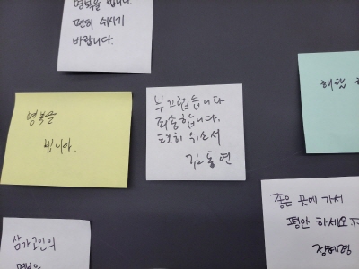 ƯÈ÷ ÇÕµ¿ºÐÇâ¼Ò ¿ìÃø¿¡´Â Á¶¹®°´µéÀÌ Ã߸ð±ÛÀ» ÀûÀº Æ÷½ºÆ®ÀÕÀÌ ºÙ¾î Àִµ¥, ±è Áö»ç´Â À̳¯ Èñ»ýÀÚµéÀÇ ¸íº¹À» ºô°í Æ÷½ºÆ®ÀÕÀ» ¼ö ºÐ°£ ¹Ù¶óº¸¸ç µµ¹ÎµéÀÇ ¸Þ½ÃÁö¸¦ ÂùÂùÈ÷ Àоú´Ù.