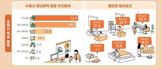 29ÀÏ °æ±âµµ ¼ö¿ø½Ã°¡ °æÀÎÁö¹æÅë°èû°ú Çù¾÷ÇØ ÃßÁøÇÑ ¡®2022³â û³â»çȸ°æÁ¦½ÇÅÂÁ¶»ç¡¯ °á°ú¿¡ µû¸£¸é ¼ö¿ø û³âµéÀº ¡®¼ö¿ø½Ã°¡ ÁßÁ¡ÀûÀ¸·Î ÃßÁøÇÏ±æ ¹Ù¶ó´Â û³âÁ¤Ã¥¡¯(1¡¤2¼øÀ§ ÇÕ»ê)À¸·Î ¡®ÁÖ°ÅÁö¿ø¡¯(72.4%)À» °¡Àå ¸¹ÀÌ ¼±ÅÃÇß´Ù. ¡®Ã롤â¾÷ Áö¿ø¡¯(69.0%), ¡®º¹Áö¡¤¹®È Áö¿ø¡¯(30.0%)ÀÌ µÚ¸¦ À̾ú´Ù.