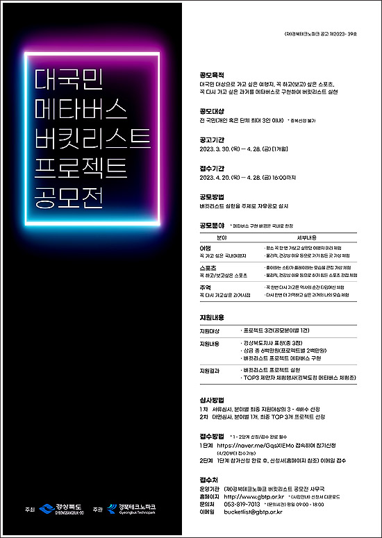 À̹ø °ø¸ðÀüÀº ¡®¸ÞŸ°æºÏ ¾ó¶óÀ̾𽺠ÇÁ·ÎÁ§Æ®±×·ì ¿î¿µ Áö¿ø»ç¾÷¡¯ Áß ÁöÁ¤°úÁ¦·Î ÃßÁøÇÏ´Â »ç¾÷À¸·Î ¡â°¡°í ½ÍÀº ¿©ÇàÁö ¡â²À ÇÏ°í ½ÍÀº ½ºÆ÷Ã÷ ¡â²À ´Ù½Ã °¡°í ½ÍÀº °ú°Å µî 3°³ ºÐ¾ß·Î ÁøÇàÇÑ´Ù.
