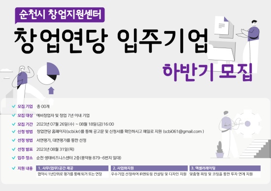 Àü¶ó³²µµ ¼øÃµ½Ã´Â â¾÷Áö¿ø¼¾ÅÍ ¡®Ã¢¾÷¿¬´ç¡¯¿¡ ÀÔÁÖÇÒ 13°³ ³»¿ÜÀÇ »õ·Î¿î ¿¹ºñ¡¤Ãʱâ â¾÷±â¾÷À» ´ÙÀ½´Þ 18ÀϱîÁö ¸ðÁýÇÑ´Ù.
