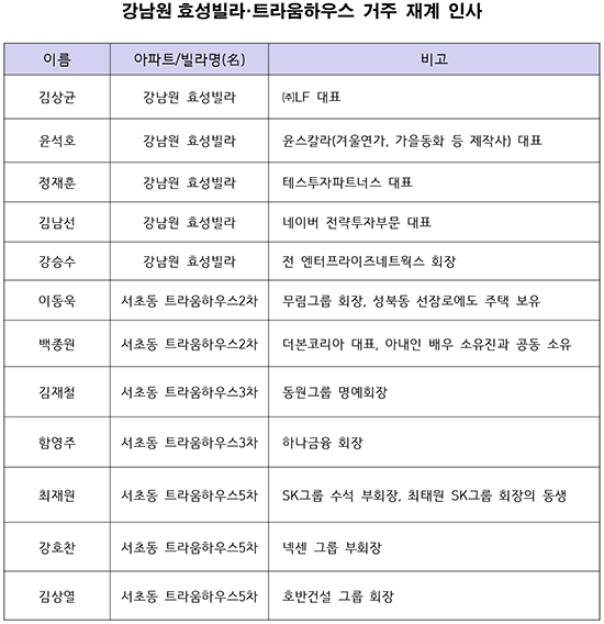 Æ®¶ó¿òÇϿ콺 2Â÷ º¹Ãþ ±¸Á¶ÀÇ Àü¿ë¸éÀû 88Æò¿¡ À̵¿¿í ¹«¸²±×·ì ȸÀå, ¹éÁ¾¿ø ´õº»ÄÚ¸®¾Æ ´ëÇ¥¿Í ±×ÀÇ ¾Æ³»ÀÎ ¹è¿ì ¼ÒÀ¯Áø, Æ®¶ó¿òÇϿ콺 5Â÷¿¡ ÃÖÀç¿ø SK±×·ì ¼ö¼® ºÎȸÀå, °È£Âù ³Ø¼¾±×·ì ºÎȸÀå, ±è»ó¿ È£¹Ý±×·ì ÃѼö µîÀÌ °ÅÁÖÇϰí ÀÖ°í ±èÀçö µ¿¿ø±×·ì ¸í¿¹È¸ÀåÀÌ °ÅÁÖÇϰí ÀÖ´Â Æ®¶ó¿òÇϿ콺 3Â÷¿¡ ÃÖ±Ù ÇÔ¿µÁÖ Çϳª±ÝÀ¶ ȸÀåµµ ÀÔ¼ºÇß´Ù. ½Ã¼¼´Â 65¾ï¡80¾ï ¿øÀ¸·Î ¾Ë·ÁÁ® ÀÖÀ¸³ª °Å·¡´Â µå¹® ÆíÀÌ´Ù.