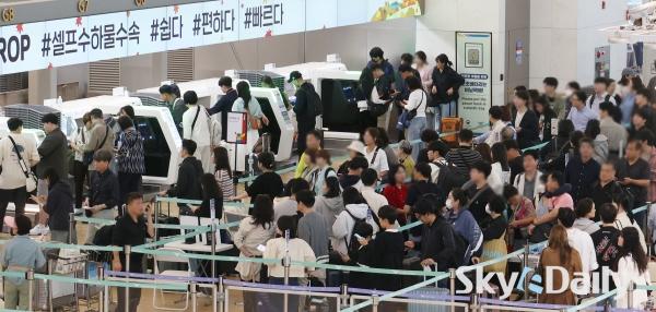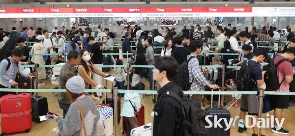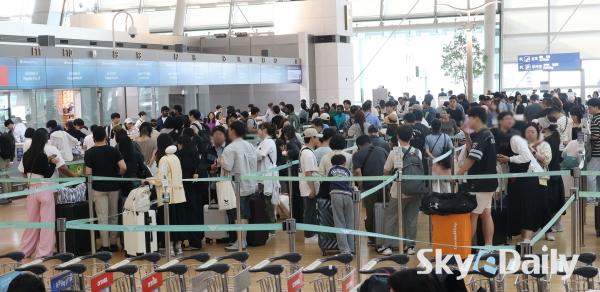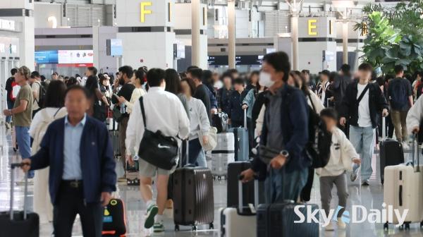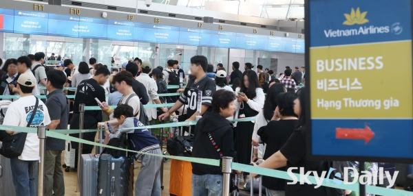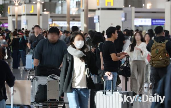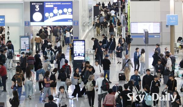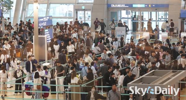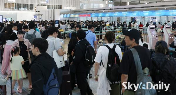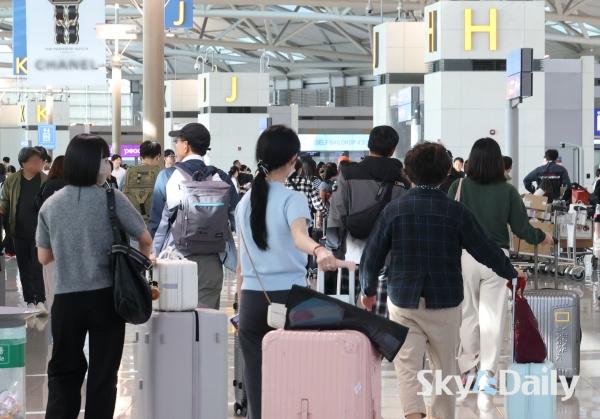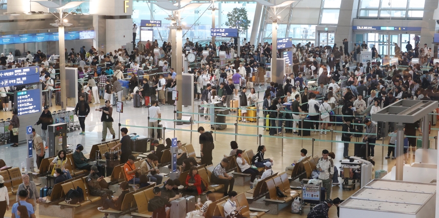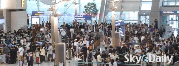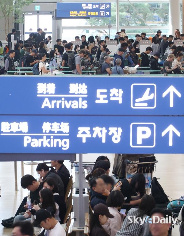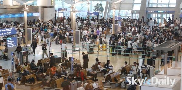 ¡ã Ãß¼® ¿¬ÈÞ¸¦ ¾ÕµÐ 2ÀÏ ÀÎõ±¹Á¦°øÇ× Á¦1¿©°´Å͹̳ÎÀÌ ¿©Çà°´µéÀÌ Å¾½Â ¼ö¼ÓÀ» À§ÇØ ´ë±âÇϰí ÀÖ´Â ¿©Çà°´µé·Î ºÏÀûÀ̰í ÀÖ´Ù. ¹Ú¹Ì³ª ±âÀÚ ¨Ï½ºÄ«À̵¥Àϸ®