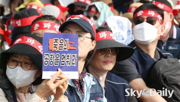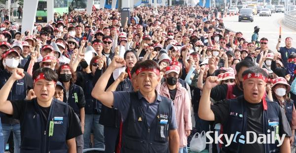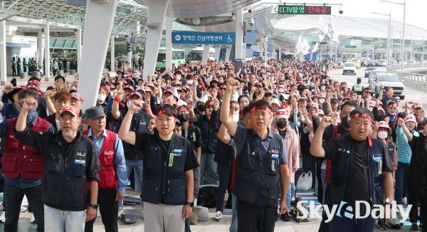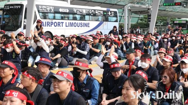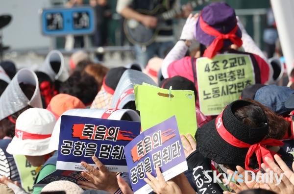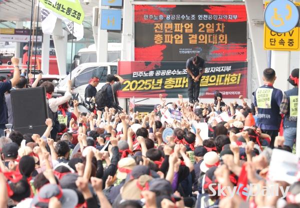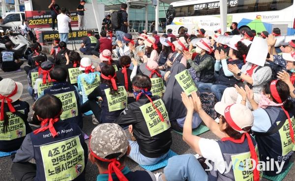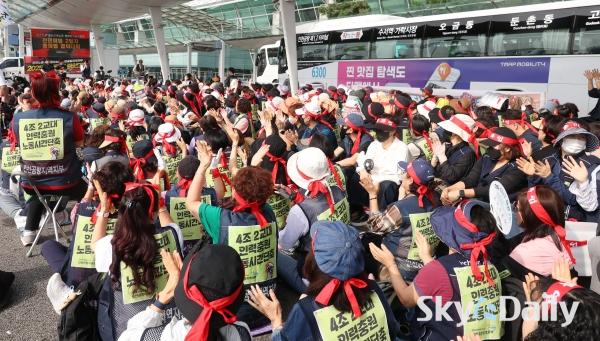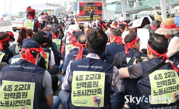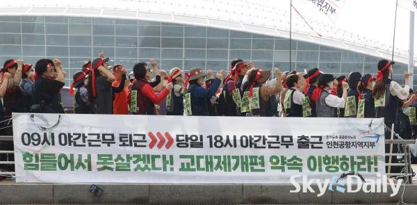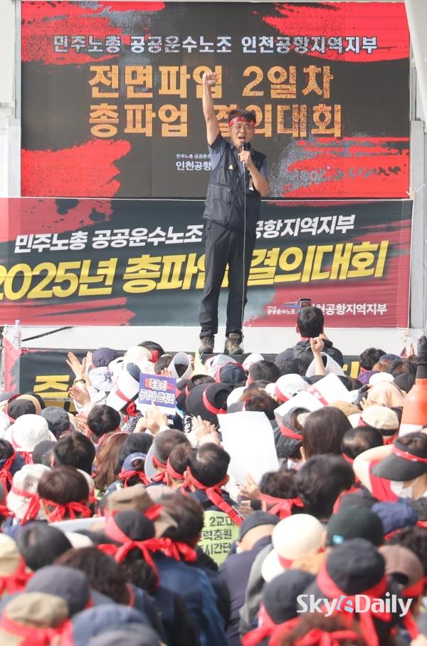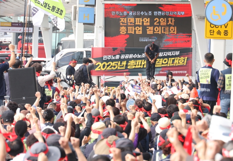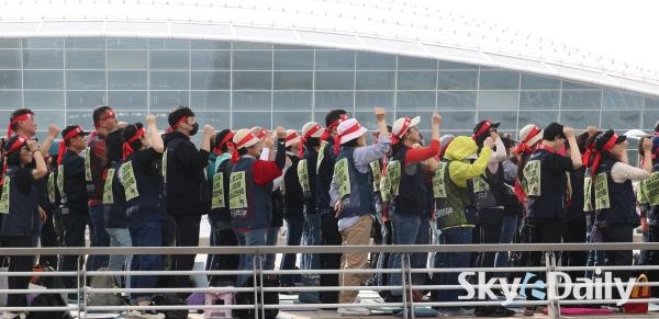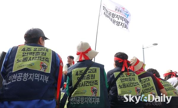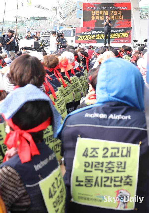 ¡ã 2ÀÏ ÀÎõ±¹Á¦°øÇ× Á¦1¿©°´Å͹̳ο¡¼ ¿¸° ¹ÎÁÖ³ëÃÑ °ø°ø¿î¼ö³ëÁ¶ ÀÎõ°øÇ×Áö¿ªÁöºÎ Àü¸éÆÄ¾÷ 2ÀÏÂ÷ ÃÑÆÄ¾÷ °áÀÇ´ëȸ¿¡¼ Âü¼®ÀÚµéÀÌ ±¸È£¸¦ ¿ÜÄ¡°í ÀÖ´Ù. À̵éÀº 4Á¶ 2±³´ë ±Ù¹«¿Í ÀÎ·Â Ãæ¿ø, ÀÚȸ»ç Á÷¿ø ºÒÀÌÀÍ °³¼± µîÀ» Ã˱¸Çß´Ù. ´çÀå Ç×°ø±â Áö¿¬ µî¿¡ Â÷ÁúÀº ¾ø¾úÁö¸¸ ÆÄ¾÷ Àå±âȽà ȥ¶õÀÌ ¿¹»óµÈ´Ù. ¹Ú¹Ì³ª ±âÀÚ ¨Ï½ºÄ«À̵¥Àϸ®