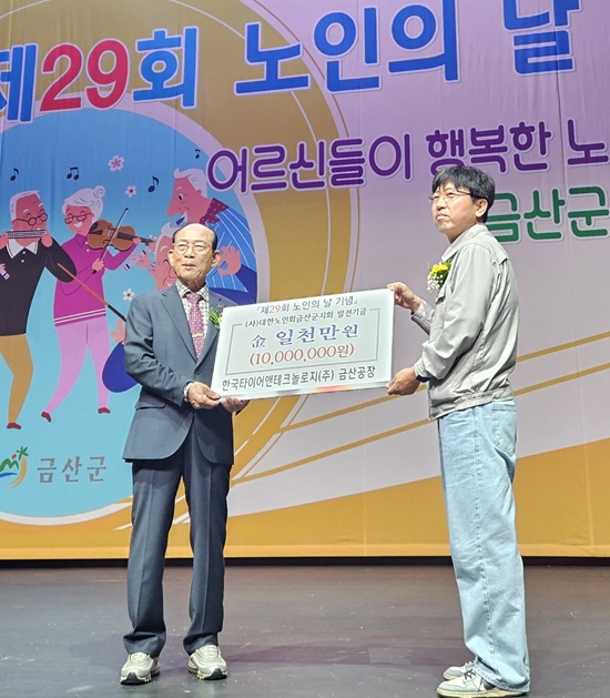 Çѱ¹Å¸ÀÌ¾î¾ØÅ×Å©³î·ÎÁö(ÀÌÇÏ Çѱ¹Å¸À̾î)´Â 2ÀÏ ÃæÃ»³²µµ ±Ý»ê±º ±Ý»ê´Ù¶ô¿ø¿¡¼ °³ÃÖµÈ Á¦29ȸ ³ëÀÎÀÇ ³¯ ±â³ä½Ä¿¡¼ ´ëÇѳëÀÎȸ ±Ý»ê±ºÁöȸ¿¡ ¹ßÀü±â±ÝÀ» Àü´ÞÇß´Ù.