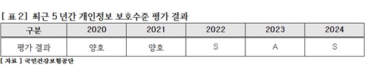 ÀÌ ¶§¹®ÀÎÁö °ø´ÜÀº °³ÀÎÁ¤º¸ °ü¸® ¼öÁØ Æò°¡¿¡¼ ¿ì¼öÇÑ ¼º°ú¸¦ º¸¿´´Ù. °Çº¸°ø´ÜÀº 2021³â Á÷Àå°¡ÀÔÀÚ 119¸íÀÇ Á÷Àå Á¤º¸°¡ ´ëºÎ¾÷ÀÚ¿¡°Ô À¯ÃâµÈ Àü·Ê°¡ ÀÖ¾úÀ½¿¡µµ °³ÀÎÁ¤º¸º¸È£À§¿øÈ¸°¡ ½ÃÇàÇÏ´Â °ø°ø±â°ü °³ÀÎÁ¤º¸ °ü¸®¼öÁØ Áø´Ü¿¡¼ ¾çÈ£ µî±ÞÀ» ¹Þ¾Ò´Ù. ÀÌÈÄ 2022³â ÃÖ°í ¼öÁØÀÎ S µî±Þ, 2023³â A µî±Þ, 2024³â ´Ù½Ã S µî±Þ ¹Þ¾Ò´Ù.
