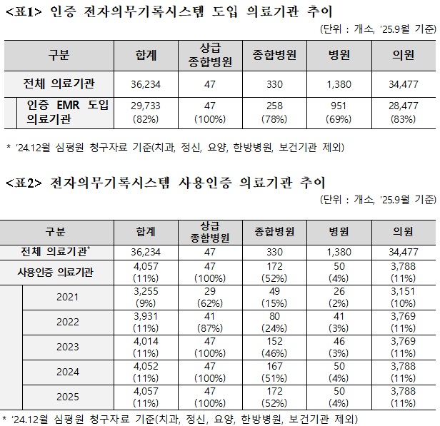 ³²Àμø ´õºÒ¾î¹ÎÁÖ´ç ÀÇ¿ø(¼¿ï¼ÛÆÄ±¸º´¡¤º¸°Çº¹ÁöÀ§)Àº Çѱ¹º¸°ÇÀÇ·áÁ¤º¸¿øÀ¸·ÎºÎÅÍ Á¦Ãâ¹ÞÀº ÀڷḦ ÅëÇØ À̰°Àº ÇöȲÀ» °ø°³Çϰí EMR ÀÎÁõ Ȱ¼ºÈ Çʿ伺À» °Á¶Çß´Ù. ÀÚ·á¿¡ µû¸£¸é ¿ÃÇØ 9¿ù ±âÁØ Àüü ÀÇ·á±â°ü 3¸¸ 6234°³¼Ò Áß EMR ½Ã½ºÅÛÀ» µµÀÔÇÑ ±â°üÀº 2¸¸ 9733°³¼Ò·Î 82%¿¡ ´ÞÇÏÁö¸¸, ÀÌ °¡¿îµ¥ EMR »ç¿ëÀÎÁõÀ» ¹ÞÀº ±â°üÀº 4057°³¼Ò·Î 11%¿¡ ¸Ó¹°·¶´Ù.