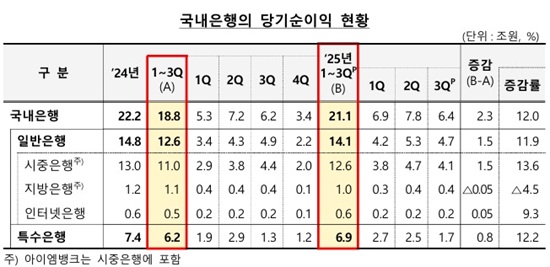 20ÀÏ ±ÝÀ¶°¨µ¶¿øÀÌ ¹ßÇ¥ÇÑ ¡®2025³â 1~3ºÐ±â ±¹³»ÀºÇà ¿µ¾÷½ÇÀû(ÀáÁ¤)¡¯¿¡ µû¸£¸é, ÀϹÝÀºÇà(½ÃÁß¡¤ÀÎÅͳݡ¤Áö¹æ)Àº 14Á¶1000¾ï ¿øÀÇ ¼øÀÌÀÍÀ», Ư¼öÀºÇàÀº 6Á¶9000¾ï ¿øÀÇ ¼øÀÌÀÍÀ» °¢°¢ °Åµ×´Ù. Àü³â µ¿±â ´ëºñ °¢°¢ 11.9%, 12.2% Áõ°¡ÇÑ ¼öÄ¡´Ù.