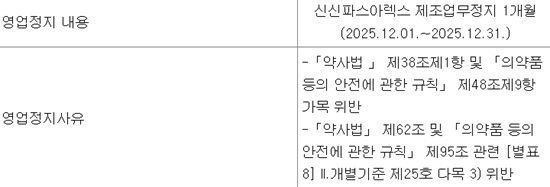 ½Å½ÅÁ¦¾àÀº ½Å½ÅÆÄ½º¾Æ·º½º Á¦Á¶¾÷¹«Á¤Áö 1°³¿ùÀ» óºÐ¹Þ¾Ò´Ù°í 19ÀÏ °ø½ÃÇß´Ù.
