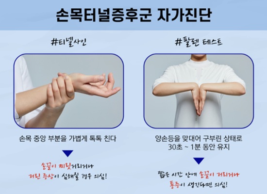 ¼Õ¸ñÅͳÎÁõÈıºÀÌ ÀÇ½ÉµÉ °æ¿ì Áý¿¡¼µµ °£´ÜÇÑ ÀÚ°¡ Áø´ÜÀÌ °¡´ÉÇÏ´Ù. ¼Õ¸ñ Áß¾ÓÀ» µÎµå·ÈÀ» ¶§ ¼Õ³¡ Àú¸²ÀÌ ½ÉÇØÁö´Â ¡®Æ¼³Ú ¡ÈÄ¡¯ ¾ç¼Õ µîÀ» ¸Â´ë°í ¼Õ¸ñÀ» 30ÃÊ µ¿¾È ±ÁÇûÀ» ¶§ Àú¸²ÀÌ ¹ß»ýÇÏ´Â ¡®ÆÈ·» °Ë»ç¡¯°¡ ´ëÇ¥ÀûÀÌ´Ù. µÎ °¡Áö Áß Çϳª¶óµµ ½ÃµµÇßÀ» ¶§ Áõ»óÀÌ ÀÖ´Ù¸é Á¤Çü¿Ü°ú Àü¹®ÀÇ Áø·á¸¦ ±ÇÇÑ´Ù.