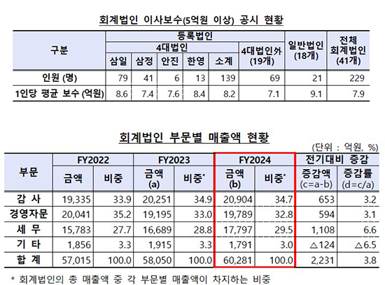 Àüü ȸ°è¹ýÀÎ ¸ÅÃâÀº 6Á¶281¾ï ¿øÀ¸·Î Àü³âº¸´Ù 3.8% Áõ°¡Çß´Ù. ºÎ¹®º°·Î´Â °¨»ç 2Á¶904¾ï ¿ø(ºñÁß 34.7%), °æ¿µÀÚ¹® 1Á¶9789¾ï ¿ø(32.8%), ¼¼¹« 1Á¶7797¾ï ¿ø(29.5%) ¼øÀÌ´Ù. °¨»ç ¸ÅÃâÀº 3.2% Áõ°¡¿¡ ±×Ä£ ¹Ý¸é ¼¼¹«´Â 6.6% ´Ã¾ú´Ù. 2024»ç¾÷¿¬µµ ¿ÜºÎ°¨»ç °Ç¼ö´Â 3¸¸6756°ÇÀ¸·Î 6.1% ´Ã¾ú°í, ÀÌ Áß »óÀå»ç °¨»çÀÎ µî·Ï¹ýÀÎÀÌ 2¸¸587°Ç(56.0%), 4´ë ¹ýÀÎÀÌ 4844°Ç(13.2%)À» ¸Ã¾Ò´Ù.