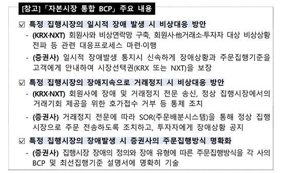ÅëÇÕ BCP´Â ƯÁ¤ ÁýÇà½ÃÀå¿¡ ÀϽÃÀû Àå¾Ö°¡ ¹ß»ýÇÏ´õ¶óµµ ´Ù¸¥ °Å·¡¼Ò¸¦ ÅëÇØ ÅõÀÚÀÚ°¡ °Å·¡¸¦ À̾ ¼ö ÀÖµµ·Ï ÇÏ´Â °ÍÀÌ ÁÖ¿ä °ñÀÚ´Ù. °Å·¡¼Ò(KRX¡¤NXT)´Â ȸ¿ø»ç¿Í ºñ»ó¿¬¶ô¸ÁÀ» ±¸ÃàÇØ Àå¾Ö »óȲÀ» ½Å¼ÓÈ÷ ÀüÆÄÇϰí, ÅõÀÚÀÚ¿¡°Ô ºñ»ó»óȲÀ» ¾Ë¸®´Â ÇÁ·Î¼¼½º¸¦ ¸¶·ÃÇÑ´Ù. Áõ±Ç»ç´Â Àå¾Ö ÅëÁö¸¦ ¹Þ´Â Áï½Ã ÁÖ¹® ÁýÇà ±âÁØÀ» °í°´¿¡°Ô ¾È³»ÇØ, ÅõÀÚÀÚ°¡ KRX¿Í NXT °¡¿îµ¥ ¿øÇÏ´Â ½ÃÀåÀ» ¼±ÅÃÇØ °Å·¡ÇÒ ¼ö ÀÖµµ·Ï ¼±ÅñÇÀ» º¸ÀåÇØ¾ß ÇÑ´Ù.