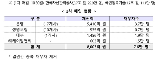 ±ÝÀ¶À§¿øÈ¸°¡ 27ÀÏ ¹ßÇ¥ÇÑ »õµµ¾à±â±Ý °ü·Ã ÀÚ·á¿¡ µû¸£¸é, À̹ø 2Â÷ ¸ÅÀÔ ´ë»óÀº °³ÀÎ(°³Àλç¾÷ÀÚ Æ÷ÇÔ)ÀÌ Áø 7³â ÀÌ»ó ¿¬Ã¼, 5000¸¸ ¿ø ÀÌÇÏ ¹«´ãº¸Ã¤±ÇÀ¸·Î ¾à 7¸¸6000¸íÀÇ ºúÀÌ Æ÷ÇԵƴÙ. ¿ÃÇØ 11¿ù 27ÀÏ ±âÁØ 2Â÷ ¸ÅÀÔ ±Ô¸ð´Â 17°³ ÀºÇàÀÌ ³Ñ±ä ä±ÇÀÌ 5410¾ï ¿ø(3¸¸7000¸í), 10°³ »ýº¸»ç°¡ 535¾ï ¿ø(7000¸í), 1°³ ´ëºÎȸ»ç°¡ 1456¾ï ¿ø(1¸¸9000¸í), ¿¹±Ýº¸Çè°ø»ç ÀÚȸ»çÀÎ ¢ßÄÉÀ̾˾ؾ¾°¡ 603¾ï ¿ø(1¸¸5000¸í)ÀÌ´Ù. ¾÷±Ç °£ Áߺ¹ 乫ÀÚ¸¦ Á¦¿ÜÇÑ ÇÕ°è´Â 8003¾ï ¿ø, 7¸¸6000¸íÀÌ´Ù.