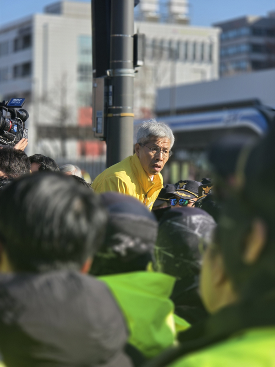 »è¹ß½ÄÀ» ¸¶Ä¡°í ±èÀ¯Áø ´ëÇ¥´Â ÀÌÀç¸í ´ëÅë·É ¸é´ã ¿äû¼¸¦ µé°í ¿ë»ê ´ëÅë·É½ÇÀ» ÇâÇØ ÇàÁøÇß´Ù. ÇàÁøÀ» ¸·À¸·Á´Â °æÂûµé°ú ºÎµúÈ÷¸ç °í¼ºÀÌ ¿À°í°¬´Ù. ±Ç¿µ±¹ Á¤ÀÇ´ç ´ëÇ¥´Â °æÂûµé¿¡°Ô ¡°Ã¥ÀÓÀÚ ´©±¸¾ß. Á¤±ÇÀÌ ¹Ù²î¾îµµ ÇÏ´Â ÁþÀº ¶È°°´Ù¡±°í ¼Ò¸®ÃÆ´Ù.