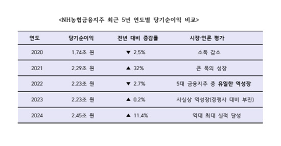 ±×·¯³ª Áö³ 5³â°£ÀÇ ¿¬µµº° ½ÇÀûÀ» º¸¸é 2024³â¿¡´Â Áö³ 2³â°£ÀÇ ºÎÁøÀ» µó°í À̼®ÁØ Àü ȸÀåÀÇ ÁöÈÖ ¾Æ·¡ NH³óÇù»ý¸í°ú NHÅõÀÚÁõ±ÇÀÇ ¼º°ú¿¡ ÈûÀÔ¾î ´ç±â¼øÀÌÀÍÀÌ Àü³â ´ëºñ 11.4% Áõ°¡ÇÏ´Â ¿ª´ë ÃÖ´ë ½ÇÀûÀ» ´Þ¼ºÇß´Ù.