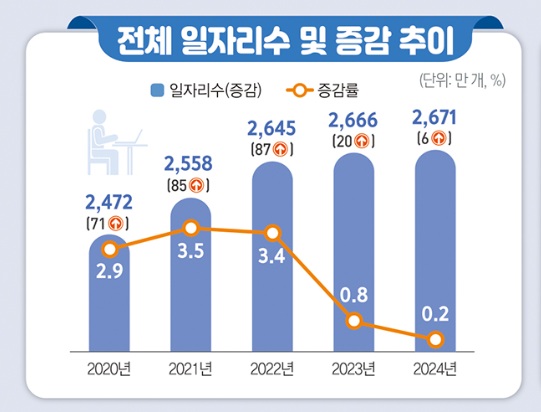 Àüü ÀÏÀÚ¸®´Â Áö³ÇØ 2671¸¸ °³·Î Àü³âº¸´Ù 6¸¸ °³ ´Ã¾î 0.2% Áõ°¡ÇÏ´Â ¼öÁØ¿¡ ±×ÃÆ´Ù. ±Ù·ÎÀÚ°¡ Àü³â°ú °°Àº ÀÚ¸®¸¦ ÁöŲ Áö¼Ó ÀÏÀÚ¸®°¡ 2089¸¸ °³·Î 78.2%, ÅðÁ÷¡¤ÀÌÁ÷À¸·Î ÀηÂÀÌ ¹Ù²ï ´ëüÀÏÀÚ¸®°¡ 299¸¸ °³·Î 11.2%¸¦ Â÷ÁöÇß´Ù. ½Å±Ô·Î ¸¸µé¾îÁø ÀÏÀÚ¸®´Â 283¸¸ °³·Î ºñÁßÀÌ 10.6%´Ù.