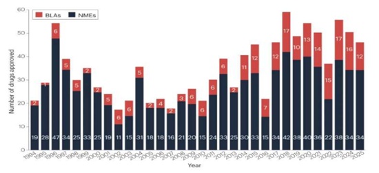 ±¸Ã¼ÀûÀº ÀÛ³â ÇÑ ÇØ µ¿¾È ¹Ì±¹ FDA ÀǾàǰÆò°¡¿¬±¸¼¾ÅÍ(CDER)´Â ½Å¹°Áú½Å¾à(NME) 34°³, ¹ÙÀÌ¿À½Å¾à(BLA) 12°³ µî ÃÑ 46°³ ½Å¾àÀ» Çã°¡Çß´Ù. 2024³â 50°³¿¡ ºñÇØ 4°³°¡ Àû°í 2023³â 55°³¿¡ ºñÇØ¼´Â 9°³°¡ ÀûÀº ¼ýÀÚ´Ù.