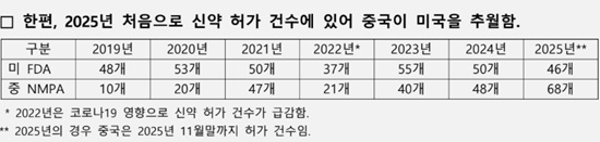 4ÀÏ Çѱ¹¹ÙÀÌ¿ÀÇùȸ¿¡ µû¸£¸é 2025³â Áß±¹ ±¹°¡¾àǰ°¨µ¶°ü¸®±¹(NMPA)ÀÌ 68°Ç Çã°¡¹ÞÀº °¡¿îµ¥ ¹Ì±¹½ÄǰÀǾ౹(FDA)Àº ÃÑ 46°³ ½Å¾àÀ» Çã°¡Çß´Ù. ÀÌ´Â 2018³â ÀÌÈÄ 2020³âÀ» Á¦¿ÜÇϰí´Â °¡Àå ÀûÀº ¼öÄ¡´Ù.