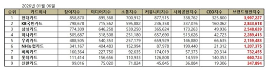 1¿ù ±¹³» ½Å¿ëÄ«µå ºê·£µåÆòÆÇ ¼øÀ§´Â Çö´ëÄ«µå, KB±¹¹ÎÄ«µå, »ï¼ºÄ«µå, ÇϳªÄ«µå, ¿ì¸®Ä«µå, NH³óÇùÄ«µå, ºñ¾¾Ä«µå, ·Ôµ¥Ä«µå, ½ÅÇÑÄ«µå ¼øÀ̾ú´Ù.