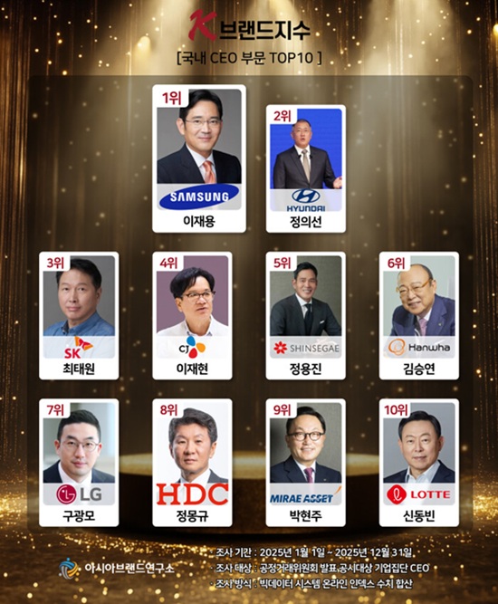 K-ºê·£µåÁö¼ö ¿ÃÇØÀÇ CEO ºÎ¹®Àº 1À§ ÀÌÀç¿ë(»ï¼º)¿¡ À̾î 2À§ Á¤ÀǼ±(Çö´ëÂ÷), 3À§ ÃÖÅ¿ø(SK), 4À§ ÀÌÀçÇö(CJ), 5À§ Á¤¿ëÁø(½Å¼¼°è), 6À§ ±è½Â¿¬(ÇÑÈ), 7À§ ±¸±¤¸ð(LG), 8À§ Á¤¸ù±Ô(HDC), 9À§ ¹ÚÇöÁÖ(¹Ì·¡¿¡¼Â), 10À§ ½Åµ¿ºó(·Ôµ¥) µîÀÌ TOP10¿¡ À̸§À» ¿Ã·È´Ù.